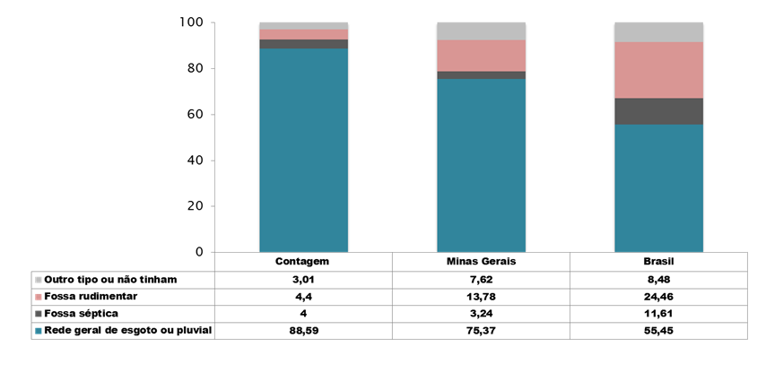 Domicílios segundo tipo de esgotamento sanitário* (%) –Contagem, Minas Gerais e Brasil – 2010