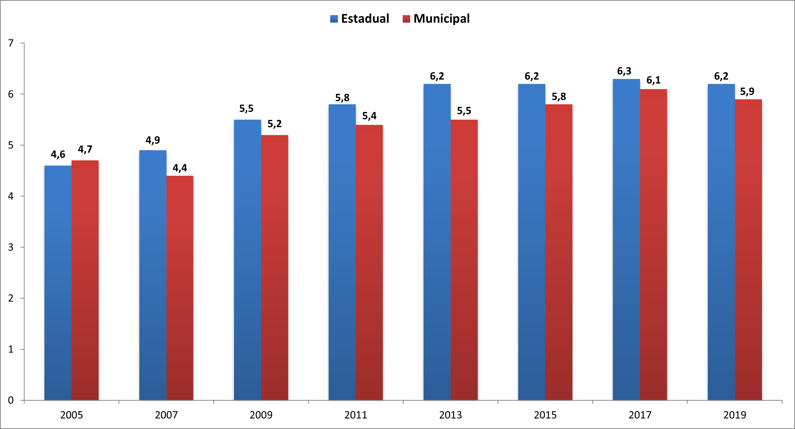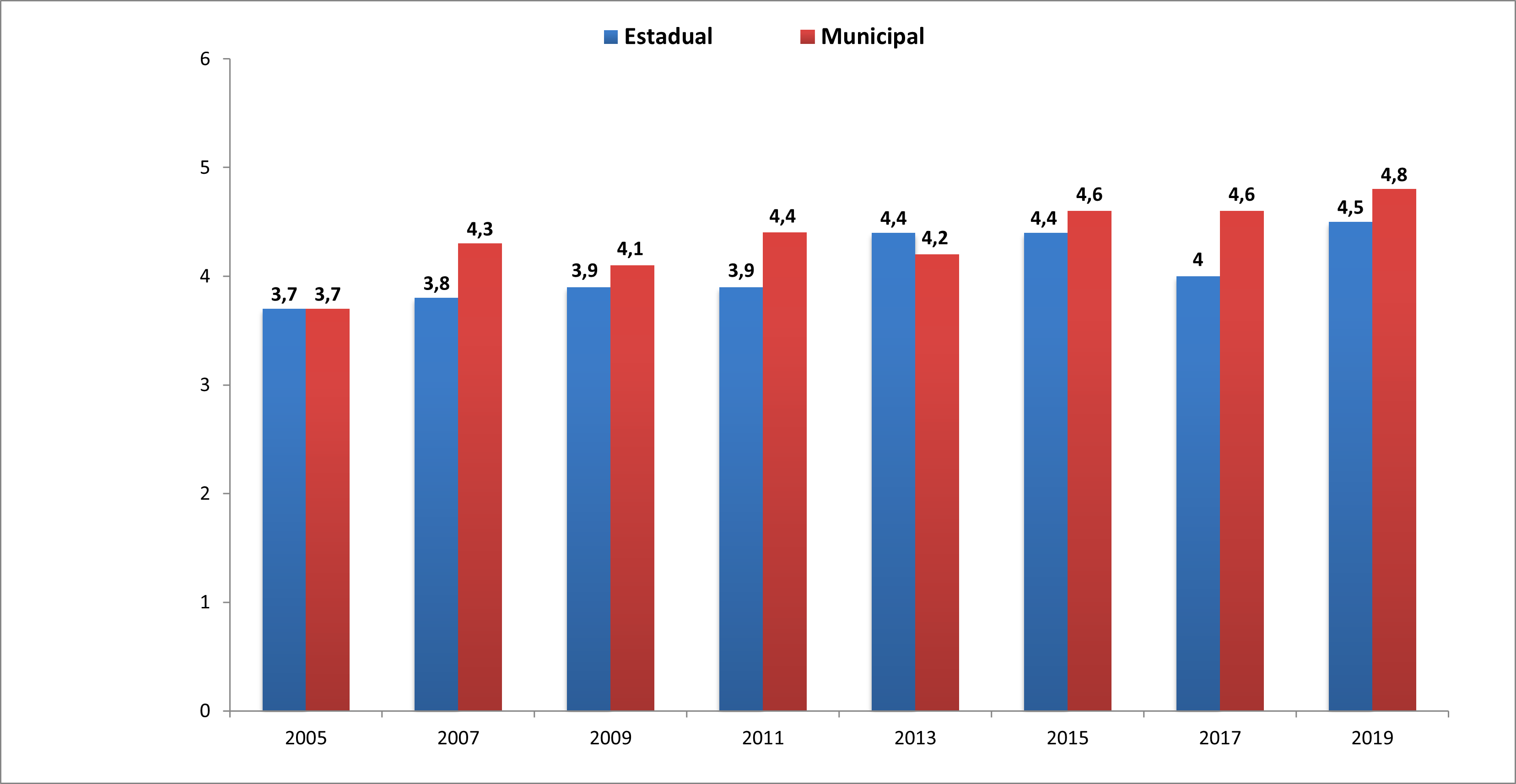 Evolução do IDEB* – 4ª série /5º ano– comparativo entre Ensino Estadual e Municipal – Contagem – 2005 a 2019
