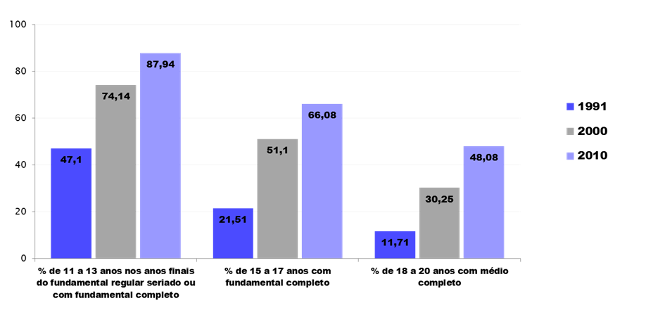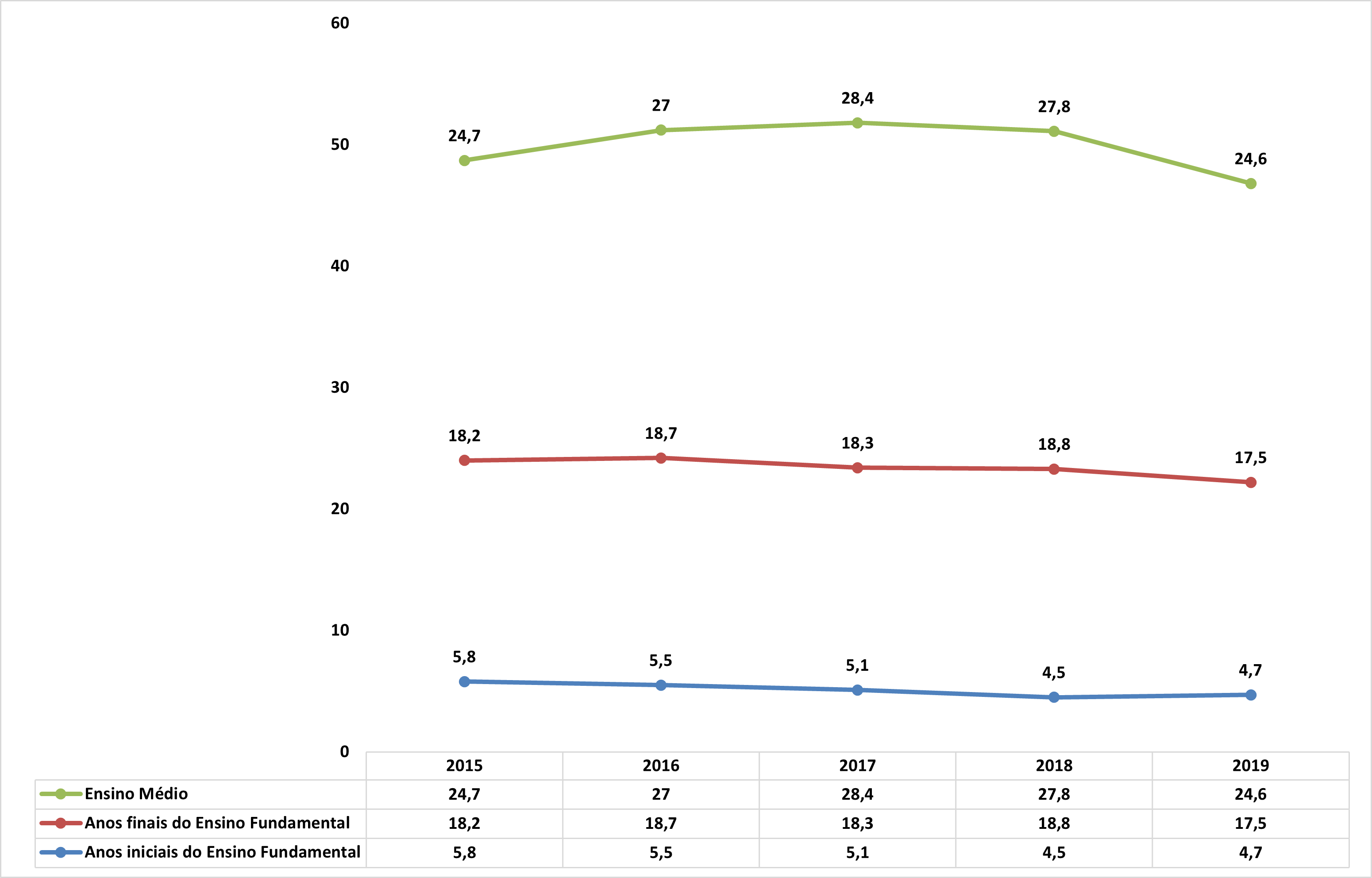 *A distorção idade-série é a proporção de alunos com atraso escolar de 2 anos ou mais. No Brasil, a criança deve ingressar no 1º ano do ensino fundamental aos 6 anos de idade, permanecendo até o 9º ano, com a expectativa de que conclua os estudos nesta modalidade até os 14 anos de idade. Na faixa etária dos 15 aos 17 anos, o jovem deve estar matriculado no Ensino Médio. As principais causas para a distorção ocorre pela repetência (reprovação) e evasão escolar dos alunos.
