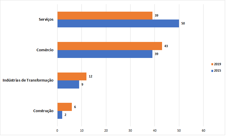 Estrutura produtiva(%) – Comparativo entre 2015 e 2019 – Contagem